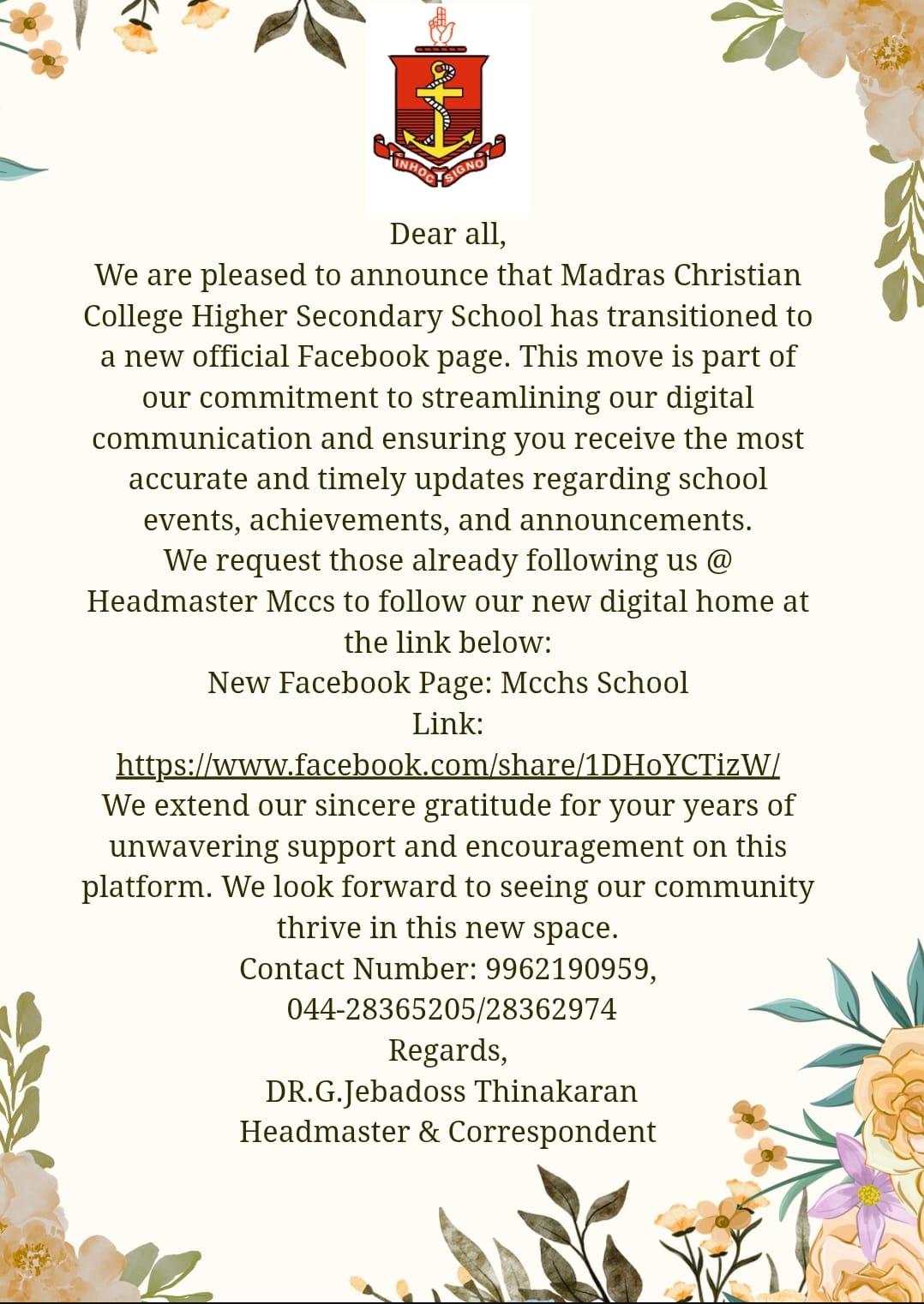 Great institutions and movements are often conceived by the concern of some men of vision for a noble cause and these institutions reach excellence to find a permanent place in the history of humanity. One such institution that has served humanity in the field of education for a hundred and seventy five years, with unflagging zeal, is the Madras Christian College Higher Secondary School.